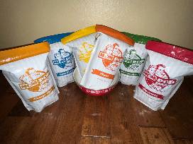 Large metal popcorn bowl filled with a variety of flavored popcorns from Mom & Pop-corn!