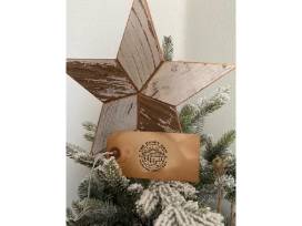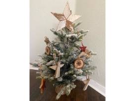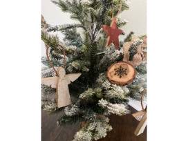 Handcrafted wooden stars, angels, and snowflakes ornaments by The Sandy Gap featured on a small, gorgeous flocked Christmas tree.