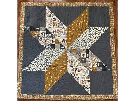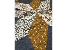 Handmade baby quilt that will keep a sweet little one warm and cozy. Beautiful colors of blues, caramel brown, and cream come together with solids and animal patterns to create a keepsake that will last a lifetime. Quilt measures 38 in. x 38 in.