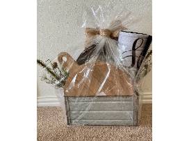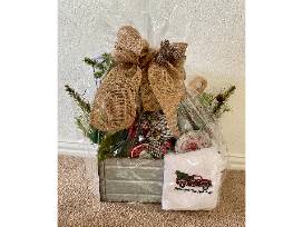 This basket has just the perfect touches you need to get your home ready for the holidays! It includes an adorable round cutting/cheese board with white snowflakes on top, a Christmas doormat, wreath, hand towels and festive ornaments!