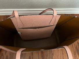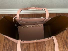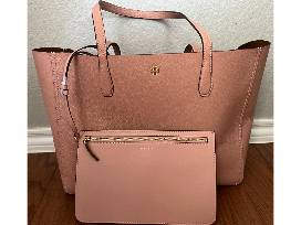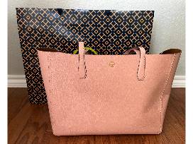 Looking for the perfect new handbag? This is the bag for you! This Tory Burch tote is made from high quality leather and comes in a beautiful light pink color (Pink Moon) with a gold Tory Burch emblem on the front of the tote. This top handle tote bag measures 14 in. wide, 11 in. tall, and 6 in. deep. and includes a small zipper pouch inside the bag.