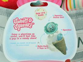 - Mint Chocolate Poop Scoop - multi-part 2-in-1 toys with a squeaker-filled chew and a squeaky tennis ball