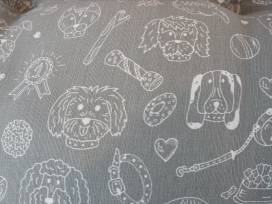Grey Hound & Home 30" x 40" pet bed with white dog faces and grey/green elephant dog toy by Petrageous.