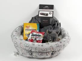 Give your cat the variety she's looking for with a grey round kitty pet bed, grey "super mouse Sam" cat toy, grey play tunnel from Best Friends, and cat treats.