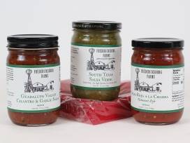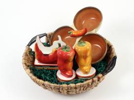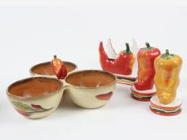 Have yourself a fiesta with these pepper-themed Clayworks pieces: a salt and pepper shaker set, dip dish, and napkin holder. Comes with a trio of salsas.