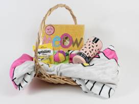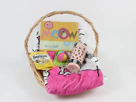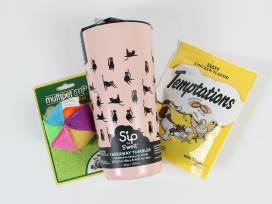You and your cat can relax together with this basket, which includes a plush blanket, two cat toys, and Temptations cat treats for kitty as well as a Sip by Swell cat tumbler and kitty-themed photo album for you.