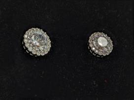 Round Cubic Zirconia stud earrings by Kenneth Jay Lane with pave halo. Pierced ear. Set in precious metal brass.