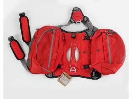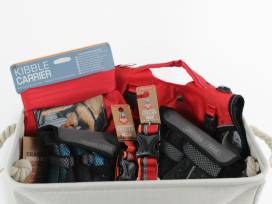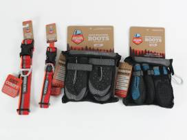 Arcadia Trail brand collars (sizes M and L), paw boots (sizes M and L), and hiking backpack/harness. Plus a Kurgo brand kibble carrier for pup's dry food.