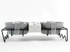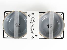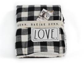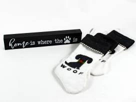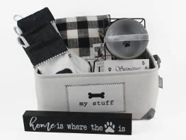 Large Rae Dunn black and white checkered blanket, Black and white dog stockings, new ceramic water and food dishes, plus a "home is where the [paw print] is" sign.