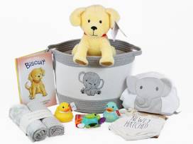 Biscuit, The Little Yellow Puppy kid's book, plus stuffed animal of the main character. Elephant storage basket filled with all the baby toys and clothes a newborn could want. Perfect for those expecting or those with a newborn!