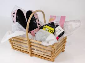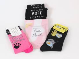 Show your feet a little love while showing your kitty love with these cat-themed TOMS pink slip ons (size 9), three pairs of cat-themed socks, and a foot mask.