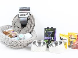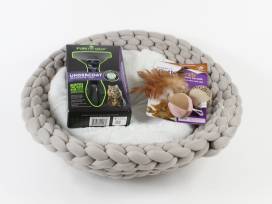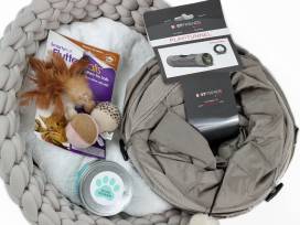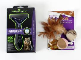 Let your cat snooze in style and comfort in this big knit/woven grey cat bed with plush pad. When they're done with their snooze, they can play with the Flutter Balls, run through their play tunnel, or get groomed with the Furminator deshedding tool that really gets into the undercoat. After a long day of working up an appetite, they can snack on the Temptations treats or eat out of their fancy tilted food and water dishes.