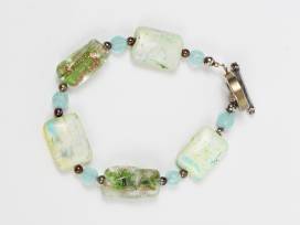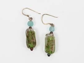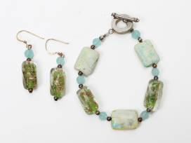This blue and green glass beaded necklace set will make you feel like you're at the beach. Gold flecks run throughout. Made with silver and blue beads.