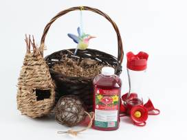 Bring all the hummingbirds to the yard with this hummingbird feeder, bottle of nectar, nest stuffing ball, and wicker house.