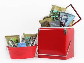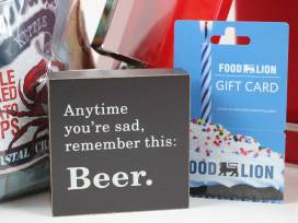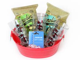 Watch the Wolfpack play at home while showing your NC State and Carolina pride with this party pack that comes with a retro red cooler from World Market, six NC State Tuffy pint glasses, 12-pack of Carolina Kettle chips featuring all flavors, $25 Food Lion gift card to pick your own beverage, and an "Anytime you're sad, remember this: Beer." sign.