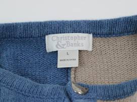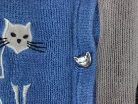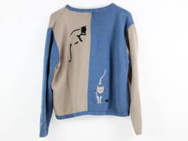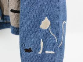 0Show your love for cats with this knit sweater by Christopher & Banks. Blue and taupe with knit embroidery of cats, along with cat buttons. Adult women's size L.