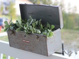 Add some rustic charm to your garden with this repurposed Craftsman toolbox made into a planter. The planter can be affixed to a fence or wall. Can also be affixed to the deck and used as a small cooler for cold drinks or house your gardening tools.