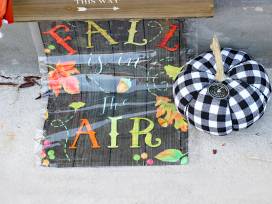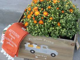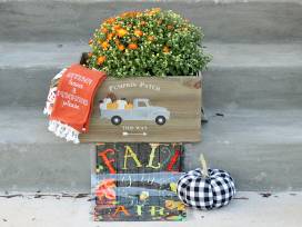 Get into the fall spirit with this vibrant orange mum placed in an adorable Pumpkin Patch crate, along with a Buffalo check plush pumpkin, autumnal dish towel set, and "Fall is in the Air" garden flag.