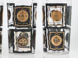 - Set of three vintage high-ball cocktail glasses featuring black and gold coin motifs from various countries