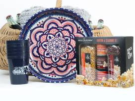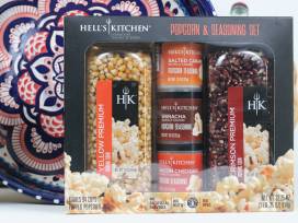 - Hell's Kitchen trio of popcorn & seasoning set: bottle of yellow popcorn kernels; bottle of crimson premium kernels; set of salted caramel, sriracha, and cheddar seasonings