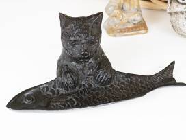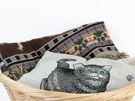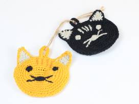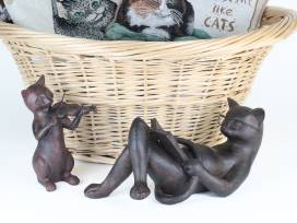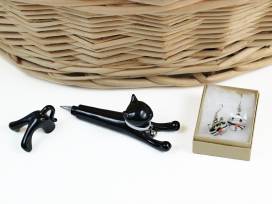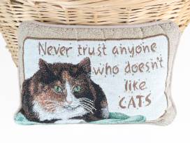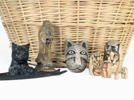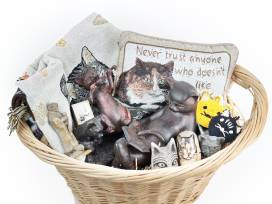 This bundle includes a small pillow with the motto "Never trust anyone who doesn't like cats," glass button earrings, pair of cotton crocheted coasters, two metallic statuettes, two medieval-inspired cat figurines, pen, carved and lacquered stacking dolls, and pen or glasses holder. A hand-picked collection for yourself or the ailurophile on your gift list.