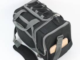 - A separate insulated, two-bottle beverage section has a padded divider and peek-through closures for tall bottles.