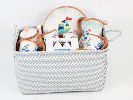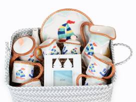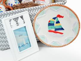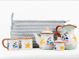 Love a nautical theme? This coffee/tea service set is right up your alley! Comes with sailboat-designed mugs (4), cream and sugar containers, teapot, platter and 3" x 5" frame.