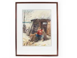 This framed original watercolor titled "Firewood" features an older man bundled up near his campfire and dog in the middle of winter. Frame 24" x 19", interior print 16" x 12".