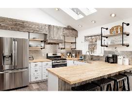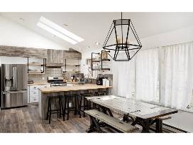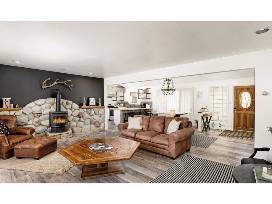 Entering onto 13 Moons Ranch and the countryside home, the open-concept living space invites everyone together in conversation at the Italian-inspired dining table and bench seating adorned with geometric chandelier lighting. Natural light engulfs the newly-constructed kitchen as you prepare a light fare with your stainless steel appliances, gas range, bar stool seating for four, and adequate entertaining crockery. The relaxed leather furnishings and pedestal gas fireplace in the living space look out upon the private alpine pond and nearby massive mountainscapes. From the seating area, immerse yourself in the pine-scented fresh air as you open the door onto the back deck space and enjoy a stunning dark night's sky from the comfortable outdoor seating area.