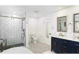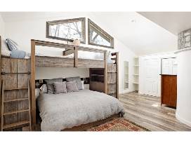 The second bedroom leads out to the deck area and celebrates simplistic mountain style with its relaxing and rustic queen bed, splendid views and small ensuite bathroom with shower. Enjoy cool, organic tones on the restful queen bed in the third bedroom, accompanied by a western secretary desk space and closet readied for a multi-week stay. The hallway bathroom displays austere decor and a rialto-style polished tile tub.