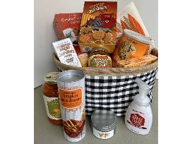 Basket full of tasty TJ's favorite autumn food items. Pasta sauce, cookies, muffin mix, and much more!