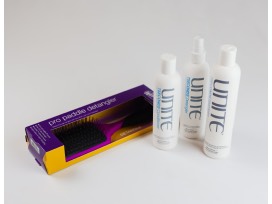 UNITE Professional Haircare product set includes Shampoo, Conditioner and Detangler. also includes a Pro-Pad Detangler brush