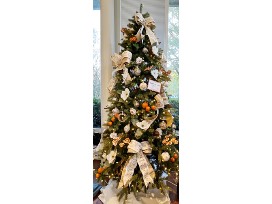 The Christmas in MS Spruce tree is adorned with magnolia blossoms and orange slice sprays, so life-like, it's almost fragrant. Gold and ivory ribbon compliments the mercury glass and gold laurel wreath ornaments. This tree is sure to make any house feel like home.