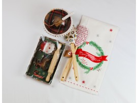 Set includes Christmas dishtowel, Holiday Cookie baking utensils, Holiday dish, and festive serving bowl and knife