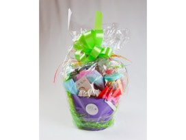 Included in this fun basket is tie dye fuzzy earmuffs, tassel keychain, candy club fruit slices, rainbow scratch art, Chunkies paint sticks, hair chalk, scented stickers, and metallic srunchie!