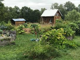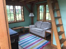 This "Stuga" (Swedish for garden cottage) includes a small living room, half bath, small refrigerator and counter for cooking, plus a loft with a queen-sized bed made of organic latex rubber. There is an outdoor shower (except in the winter).
