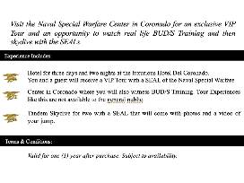 - You and a guest will receive a VIP Tour with a SEAL of the Naval Special Warfare Center in Coronado where you will also witness BUD/S Training. Tour Experiences like this are not available to the general public.