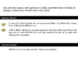 - A Navy SEAL will join you and three guests for a full day on the water. Prior to the trip, you will work with the SEALs to fully customize the day on the water with fishing and/or snorkeling.