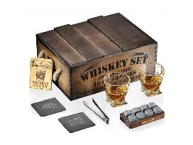 2 Old Fashioned 10 oz glasses, 8 granite whiskey stones, a storage tray, metal tongs, and recipe cards