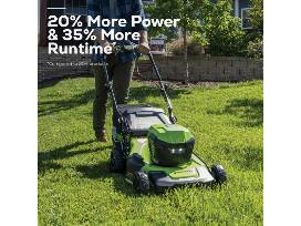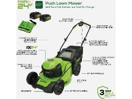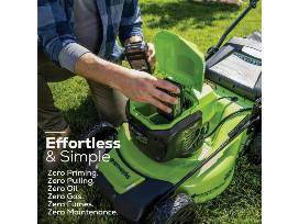Treat your yard and the greater environment, with your new Greenworks 24V 20 In. Brushless Push Lawn Mower from Jackson's Hardware. You can quickly mow up to one-half acre on a single charge, then fully recharge batteries in just 60 minutes. This lightweight, quiet-running push mower has variable speed control for mowing at comfortable speeds; intelligent power senses grass conditions to send optimal power to the blade maintaining a consistent speed that wont bog down in tall, wet, or thick grass. Greenworks exclusive Intelligent Power provides constant, fade-free power with no dangerous emissions; and combines Brushless motor technology, lithium-ion battery power, superior cutting, and ultra-fast control systems for powerful output.