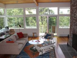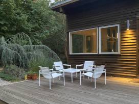 One week stay in a 4 bedroom, 3 bath home in Wellfleet, MA on Cape Cod. The house is located at the end of a dirt road. You'll be just three minutes by foot to a freshwater swimming pond and nine minutes to the ocean. The main level of the house has one bedroom and master bath, one bedroom with a single bed and one bedroom with twin beds. The lower level has a bedroom with a double bed and a twin bunk bed. This room has an attached bath. There are workspaces, outdoor decks and a screened porch with a ping pong table. There's also a charger for your Tesla.