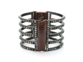 Rebel Designs signature double sided five bar bracelet. Antique brass finish, Italian vintage leather with black diamond Swarovski crystals or semi precious stones. Genuine Italian leather. Snap closure. Handmade in New York.