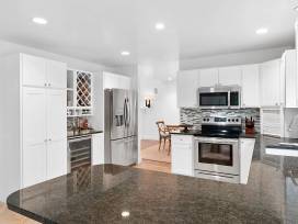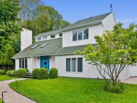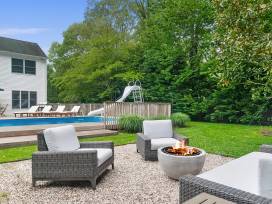 This beautifully landscaped home is situated on a quiet road. A two-story living room with a fireplace, dining room, large eat-in kitchen, and a sitting area with built-ins creates a wonderful flow. A master suite, two guest bedrooms, and a shared bathroom are on the second level. A finished lower level has an entertainment area, gym area equipped with a Peloton, ping pong table, PlayStation, and a separate laundry room. There is a saltwater pool with a slide surrounded by large hedges and a fire pit lounge creates an area perfect for relaxing.