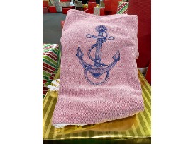 Red towel with navy blue anchor is a red drawstring bag