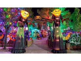 Haunted jungle ruins managed to take over the 2.5-acre theme park, beckoning spooky creatures of all shapes and sizes. There you'll meet many of them as you walk through a cemetery surrounded by hundreds of spooktacularly decorated trees and jack-o-lanterns. Friendly witches and ghosts excitedly await your arrival!
