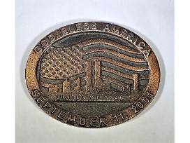 This is a coin salvaged from the metal in the 9/11 tragedy that struck the US in 2001. Also includes a large 4x8 flag.