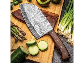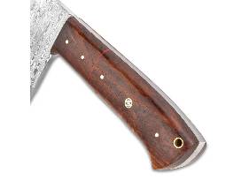 The sharp and stocky Custom Damascus Cleaver Butcher Knife is at home in the kitchen, at the campsite, or out on the hunt. It has a hefty 8", full-tang Damascus steel blade that's made to chop through any and everything including bone. The wooden handle scales are secured to the tang with brass pins and the handle has a brass lanyard, as well. The 14" overall cleaver knife slides into a premium wooden sheath that was designed to fit like a glove to protect the blade when not in use and it doubles as a cutting board.