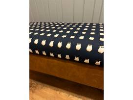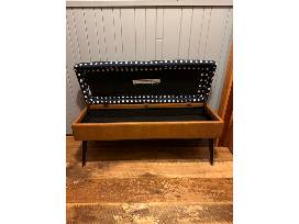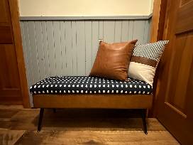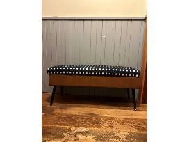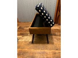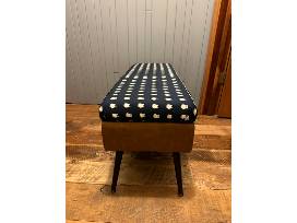 Dual purpose entry way storage bench. Beautifully hand crafted with navy elk tooth fabric by Native Designer Bethany Yellowtail. 40" L x 13.8 " W by 17" H. Paired with two matching decorative pillows
