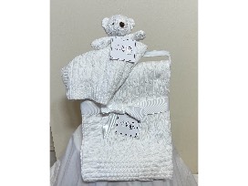 White cable knit baby blanket and teddy bear blanket combo.