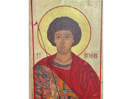 This Icon of St. George is painted in the Macedonian style with acrylic gouache and 22 caret gold leaf. The spear he used to slay the dragon is his left hand. The sword with which he was martyred in his right